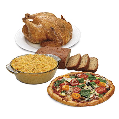 Feature : Black with silver finish / Fits a 5 lbs. Chicken or roast / Rotisserie, bake, convection and broil options / Fits two 12" pizzas / Revolving rotisserie