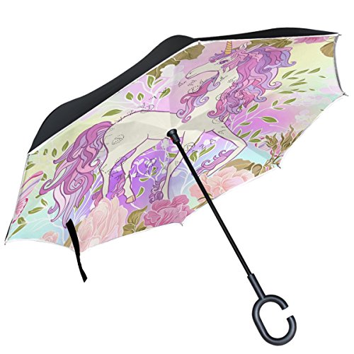 Studio : ALAZA Publisher : ALAZA Binding : Misc. Product Description ALAZA Unicorn Floral Butterfly Purple Pink reverse folding double layer inverted umbrella and rain protection umbrella with C-shaped hands free handle, best for travelling and car use. Using ALAZA umbrella, you are always protected from the rain, strong wind, snow and UV. Innovative Design: Dual Layer Design: Successfully preventing car seat from getting wet, avoiding making others clothes wet when stand close on the bus or subway. C-shaped Hand Grip: Holding an umbrella with your wrist, you can free your hands to make a phone call, to play with your cell phone, to hold a baby. Water Repellent Fabric: Protecting you well against the rain, strong wind, snow, drip permeation and UV, etc. Stand up on its own: Easy to place, it can stand up by you on its own when closed, saving much space for you.