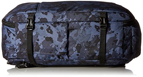 Padded 15-inch laptop compatible sleeve, quick access top pocket, side stretch pocket, padded adjustable shoulder straps that can tuck away, padded waist and sternum straps