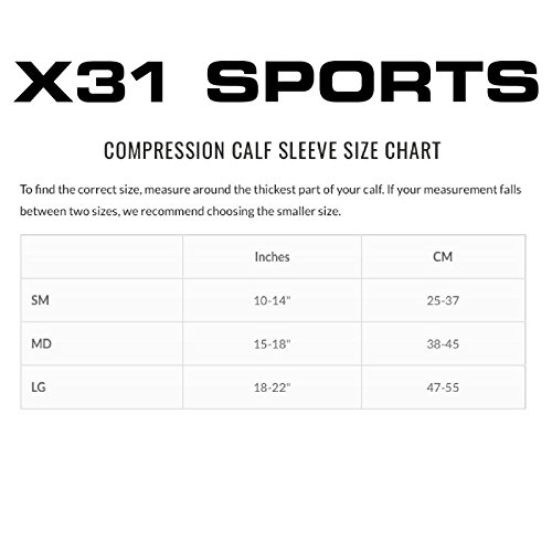 Studio : DongGuan JieJin Security Protection Equipment CO. LTD Publisher : DongGuan JieJin Security Protection Equipment CO. LTD Binding : Misc. Product Description Take your training to the next level With its' superior blend of 85% Nylon and 15% Spandex, the X31 Sports Calf Compression Sleeve promotes improved blood circulation to muscles, and helps regulate and maintain body temperature. Athletes report reduced calf cramps and lessened fatigue while training, so they can stay injury-free and able to perform at an optimal level. Moisture-wicking support that won't let you down Our unique blend provides exceptional breathability so you neither overheat nor subject muscles to the cold. The silicone grip top holds the X31 Sports Calf Compression Sleeve in place without causing circulatory issues so that you can stay in the zone during workouts and competitions. For those nursing muscle pulls or shin splints, the X31 Sports Calf Compression Sleeve provides stabilization and support to keep you on the road to recovery. To find your correct size, measure around the thickest part of your calf. If your measurement falls between two sizes, we recommend choosing the smaller size. Sleeve size SMALL = calf circumference 10"-14" (25cm-37cm) Sleeve size MEDIUM = calf circumference 15"-18" (38cm-45cm) Sleeve size LARGE = calf circumference 18"-22" (47cm-55cm) For targeted support where you need it most, add X31 Sports Calf Compression Sleeves to your cart today. 0