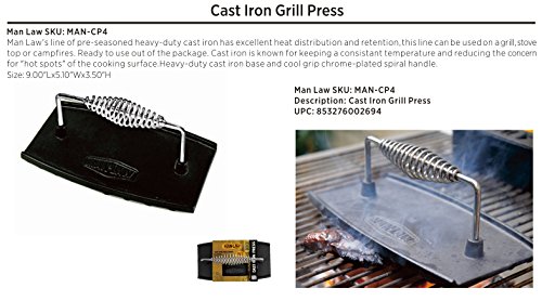 Studio : Man Law BBQ Products Publisher : Man Law BBQ Products Binding : Lawn Patio Product Description Get a perfect cook the grill marks your looking for with the MAN-CP4, man law's cast iron grill press. For use on the stove top, grill, smoker, campfire. Ideal for hamburgers, searing steaks or chops, Bacon or ham ( keeps them flat, stops the curling up of thinner cuts of meat ). 0
