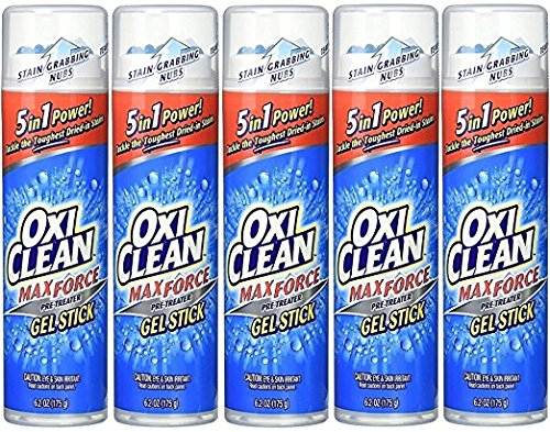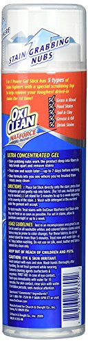 DetailsOxiClean Max Force Pre-Treater Gel StickHelp get stains out the first time with new Max Force Gel Stick pretreater! * It's special applicator helps get deep in to clothing fibers where the thick gel formula sticks to stains and breaks them down. The color-safe formula is packed with 4 types of stain fighters:Amylase Enzyme - lifts food stains from fabricSolvents/Surfactants - dissolve and trap grease and oilPolymers - bind to dirt and soils to suspend and rinse them awayProtease Enzyme - targets protein stains like grass and bloodUltra Concentrated gel formula has more power in every drop!Smooth top scrubber removes stains without damaging fabricTreat now and wash later-up to 1 week before washingNon-staining blue formula lets you see where you've been treated then rinses away clean.DirectionsFor laundry use onlyAllows follow manufacturer's guidelines for the item being cleaned.Place gel Stick directly onto the stain, press down to dispense gel and rub into fabric.(For 1st use, multiple pumps may be needed.)Allow fabric to stand 5-10 minutes, depending on the severity of the stain. Wash in the warmest water the garment will accept.WARNINGS:Eye irritantAvoid eye contactHarmful if swallowedKeep out of reach of children and petsIf contact occurs, flush immediately with water for 10-15 minutesIf swallowed, rinse mouth and drink a glass of waterIn either case, call a physicianIf on skin, rinse thoroughly with waterFeature