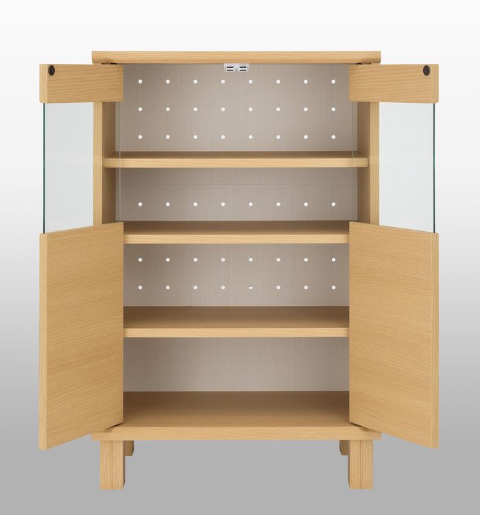 ●ガラス扉でホコリもカット、食器棚にも使えるマルチな用途のキャビネットです