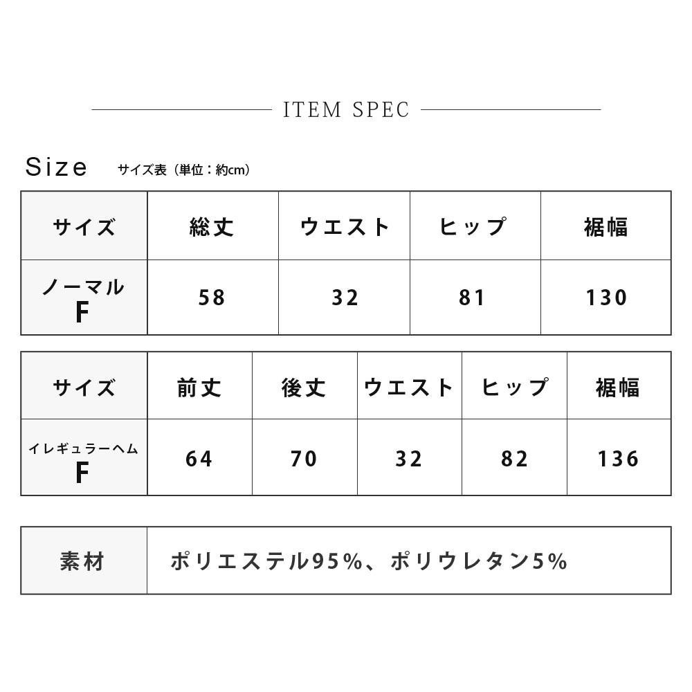 | サイズ | [イレギュラーヘム] (F) 前丈:64cm 後丈:70cm ウエスト:32cm ヒップ:82cm 裾幅:136cm [ノーマル] (F) 総丈:58cm ウエスト:32cm ヒップ:81cm 裾幅:130cm |