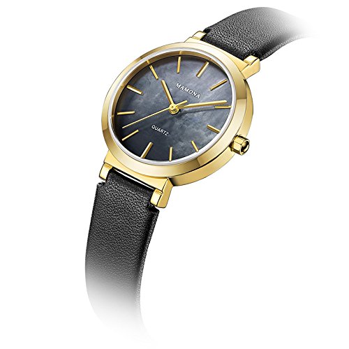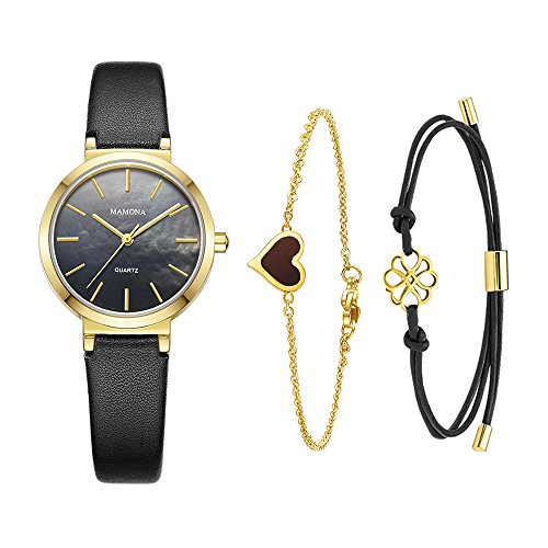 Ladies Quartz Mother Of Pearl Watch-MAMONA Gold Black and Leather Band Women bracelet set 3876LBKTS