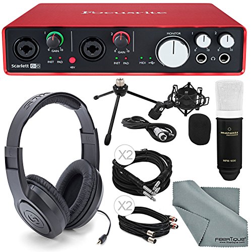 Deluxe Bundle Includes: Focusrite Scarlett 6i6 USB Audio Interface + 2 1/4" Male to 1/4" Male Instrument Cables + 2 XLR M to XLR F Microphone Cables + Samson Over-Ear Stereo Headphones + Marantz Professional Large-Diaphragm Condenser Microphone with Windscreen + Shockmount + Tripod Stand +XLR Cable