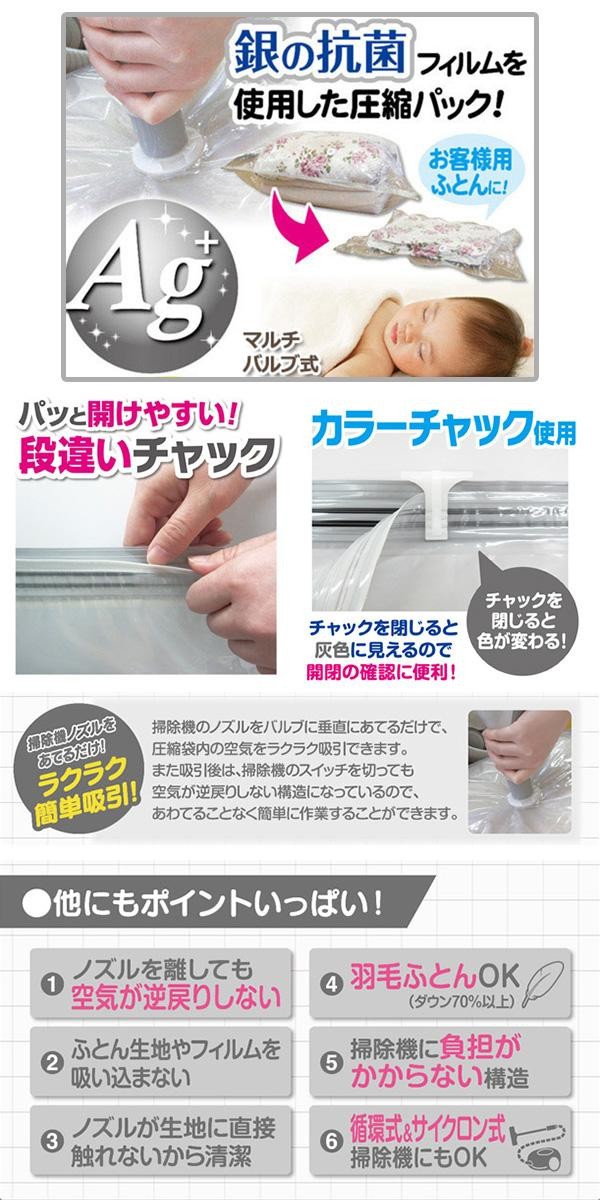 | 圧縮袋のフィルム内側に銀系無機抗菌剤を練り込んでおり、フィルム上の菌の繁殖を抑制します。ノズルを離しても空気が逆戻りしないオートロックバルブ式です。 |