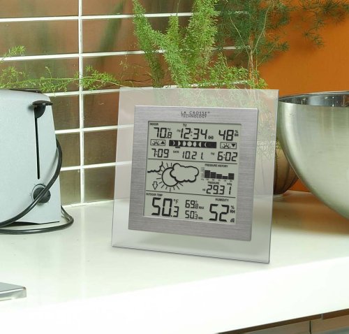 Modern design weather station with technology flare, it features more than time & temperature. Displays current barometric pressure with a historical bar graph, your future weather forecast, moon phase & sunrise/set and a whole lot more. Wireless outdoor sensor (included) transmits outdoor temperature down to -39.8°F & humidity from up to 330 feet away.Feature