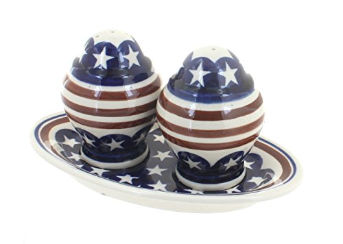 Polish Pottery Stars & Stripes Salt and Pepper Shakers with Dish