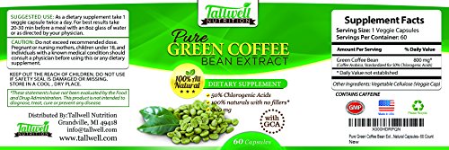 - Feature : IMPROVED APPETITE CONTROL: The key to losing weight isn't simply working out and eating right; it's also controlling what and how much you're eating. Green coffee bean extract helps reduce your urges so you can make eating healthier easier. / HEALTHY WEIGHT LOSS: A daily dose of pure green coffee bean extract works to boost your metabolism and burn body fat because it helps burn more fat cells using active chlorogenic acid. You'll lose weight faster than ever, but safely. / BOOSTS NATURAL ENERGY: Part of the reason why it's hard to get motivated to take a walk, a jog or hit the gym is because you don't have enough energy. With Tallwell Nutrition's green coffee bean extract, you'll have plenty of energy for that and so much more. / SAFE, NON-STIMULATING: Unlike some thermogenic supplements that can give you the "shakes" or "jitters," our pure green coffee bean extract is only made from 100% natural ingredients. / MONEY BACK GUARANTEE: We pride ourselves on having made the best green coffee bean extract on the market, which is why it comes backed by a 100% satisfaction guarantee.