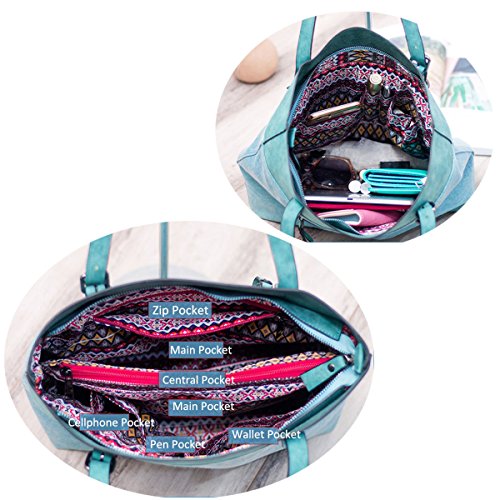 - -POCKETS: 1 Generous main pockets,1 inner central pocket, 1 inner back zipper pocket, 1 inner front cellphone pocket and 2 pen pockets, 1 Inner front wallet pocket. 1 Exterior back wall zipper pocket