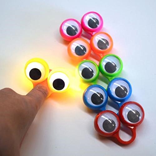 These Flashing Finger Eye Puppets will bring any hand to life with adorable charm. They have 2 googly eyes that light up when they are moved. They are made of hard plastic, measure approximately 2 inches across and 2 inches tall from the base of the ring, one size fits most fingers. Not recommended for children under the age of 3.