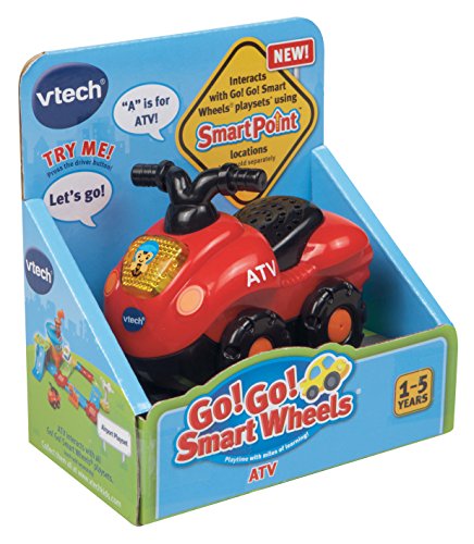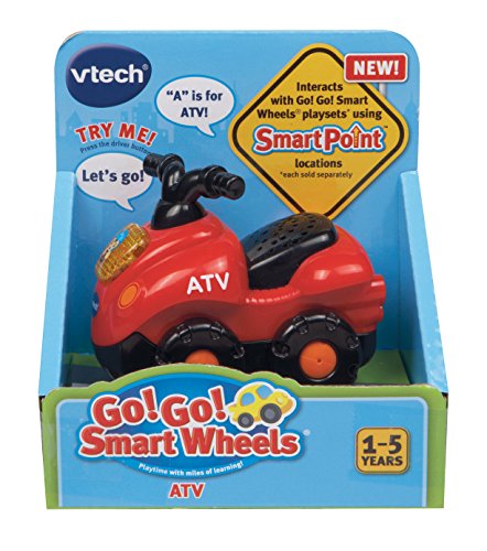 Grab the Go! Go! Smart Wheels ATV by VTech and explore all terrains of learning fun. Specially designed for little hands, it entertains with a light-up driver button that activates playful music and sounds. The electronic vehicle also responds to various SmartPoint locations with different phrases and sound effects on the many Go! Go! Smart Wheels vehicle playsets. Put off-road excitement and education in their hands with the Go! Go! Smart Wheels ATV.