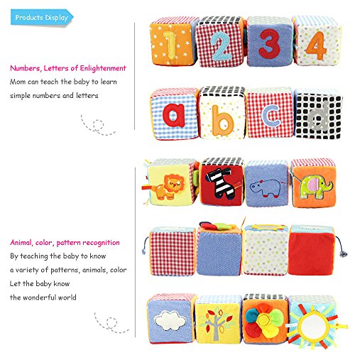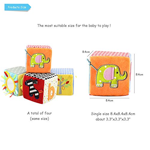 -. Feature : ★ SQUEAK - Little bells inside,gently shake and the blocks will make soft sound,not only to attract the baby's attention,but also helpful for hearing development;your little one's muscle will be stimulated by pinching the squeak and rustled papers.It is very interesting. / ★ CREATIVITY - Play cubes can be arbitrary stacked placement,it is a good way to develop baby imagination and creativity.Parents also can help or guide baby to finish their works,that will increase interaction with the baby and enhance parent-child relationship. / ★ LEARNING - Each building block has 6 different pattern surfaces(number,letter,animal,color,nature,etc.),cultivating baby's classification ability;learning basic knowledge while playing.It is helpful for formative education. / ★ EXQUISITE WORKMANSHIP - TOLOLO building blocks are made of safety and environmental material.They are full of fiber and foam so the elasticity is very good.With beautiful P.R.Inting and delicate embroidery,very colorful and will not fade;no harm for baby and they can rest assured to play. / ★ GREAT BABY GIFT - This Rattle Building Blocks Set makes a great present for any expectant mother,newborn baby or toddler boy or girl. Give it as a special gift for baby showers, birthday parties or Christmas gatherings. Babies will love and enjoy these toys,and parents will appreciate you for such a thoughtful and engaging gift.