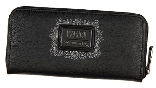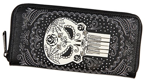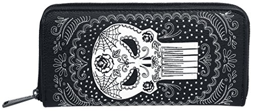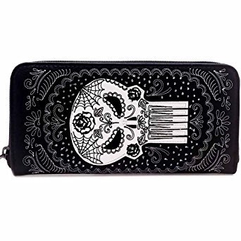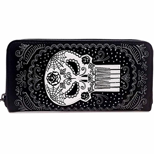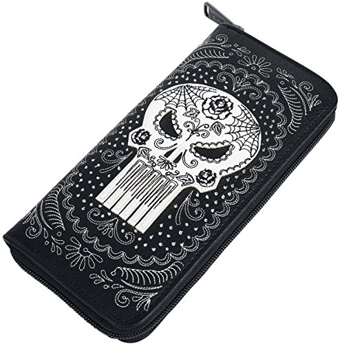 Binding : Apparel Product Description it's time to rock and roll. This badass super hero is in our house. The Marvel Punisher Sugar Skull Zip wallet from Loungefly features a full-front Punisher logo patch applique with sugar skull embroidered details in the front, logo plaque hardware, fully lined interior with a side compartment and eight card slots, and zip around closure. 0