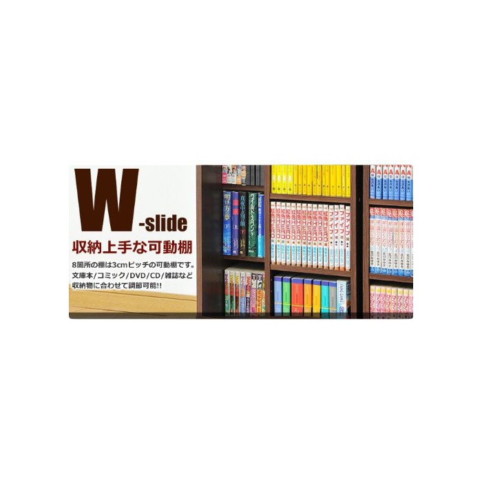 상품 설명:슬라이드식의 서가가 더블로 부속!오심타입의 대량의 책이나 미디어가 꺼내기 쉬운 편리 서가【최대 수납 책수】(기준)A6사이즈(문고본):약340 책신서판(신서 코믹소):약340 책B6사이즈(실용서 코믹대):약340 책DVD:약310 매CD:320매 【수납 가능한 본 미디어】슬라이드붕:A6사이즈(문고본)신서판(신서 코믹소)B6사이즈(실용서 코믹대)DVD(2 단만)오선반:A6사이즈(문고본)신서판(신서 코믹소)B6사이즈(실용서 코믹대)DVDCD【최대 수납 책수】(기준)A6사이즈(문고본):약340 책신서판(신서 코믹소):약340 책B6사이즈(실용서 코믹대):약340 책DVD:약310 매CD:320매 오심타입이기 때문에,대형 코믹 책이나 DVD도 충분히 수납에 옵니다.전면으로 좌우로 슬라이드 할 수 있는 슬라이드식붕을 2 개설치.슬라이드붕의 뒤에 오선반이 있고, 슬라이드붕을 좌우로 이동 하는 것으로 안쪽의 책을 한 눈에 알아 출납이 자유.슬라이드붕에는 대형 캐스터를 채용.코믹이나 문고본을 가득히 수납하며