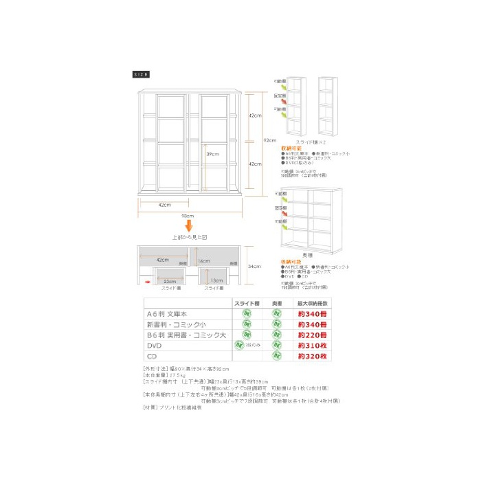 【수납 가능한 본 미디어】 슬라이드붕:A6사이즈(문고본)신서판(신서 코믹소)B6사이즈(실용서 코믹대)DVD(2 단만),오선반:A6사이즈(문고본)신서판(신서 코믹소)B6사이즈(실용서 코믹대)DVDCD
