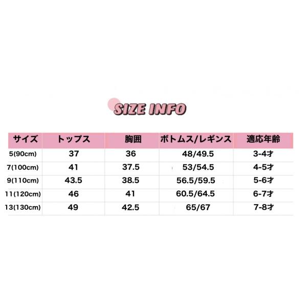 | サイズ | 寸法CM 上着 【5】 90着丈37 胸囲36 【7】 100着丈41 胸囲37.5 【9】 110着丈43.5 胸囲38.5 【11】 120着丈46 胸囲41 【13】 130着丈49 胸囲42.5 レギンス付きボトムス/スカート 【5】 90総丈48/49.5 【7】 100総丈53/54.5 【9】 110総丈56.5/59.5 【11】120総丈60.5/64.5 【13】130総丈65/67 |