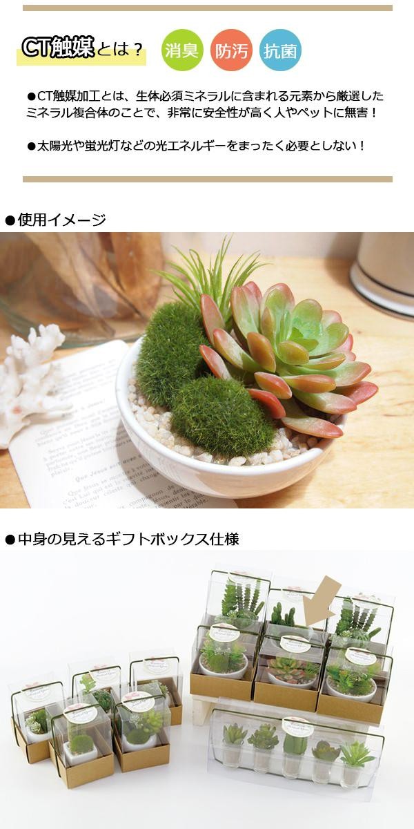 小さな多肉植物やサボテン、コケを寄せ植えしたキュートな消臭アーティフィシャルグリーンです。コンパクトなサイズで、玄関や洗面所、デスクなどインテリアのちょっとした場所を手軽に楽しく彩ります。 |