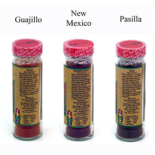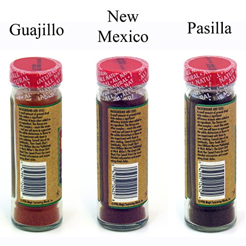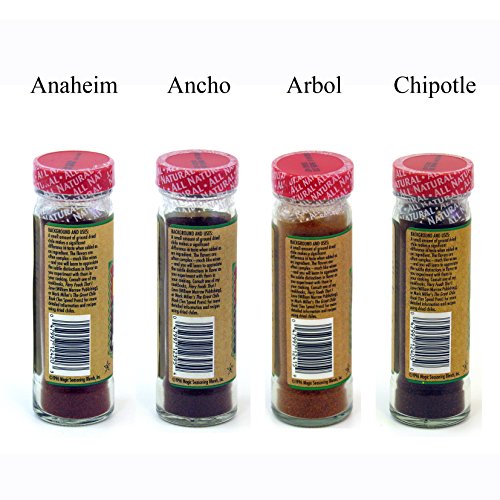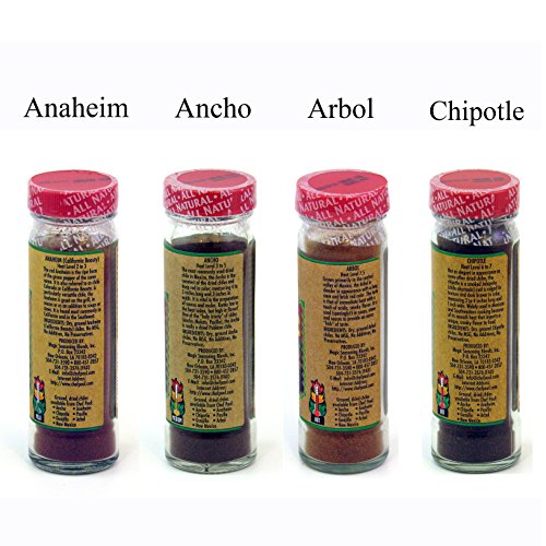 One bottle each of the Ground Dried Magic Chiles (Ancho, New Mexico, Anaheim, Chipotle, Guajillo, Arbol and Pasilla).