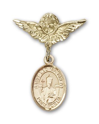 (Religious Obsession)/Baby Stationery/Stationery Sets/DIRECT FROM USA/ReligiousObsession's Gold Filled Baby Badge with St. Leo the Great Charm and Angel with Wings B...