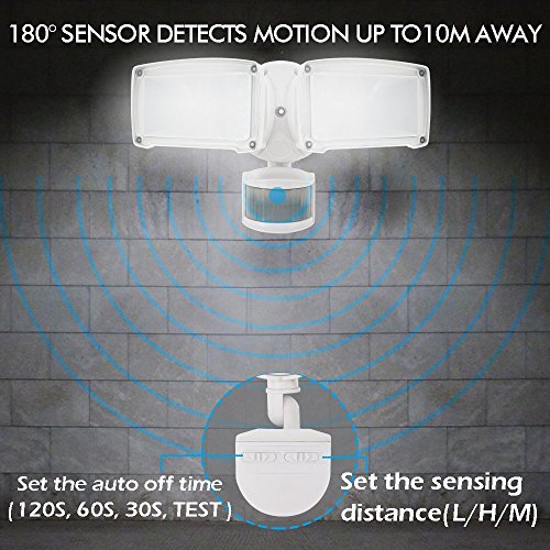 - Powerful Motion Sensor Lights for Security: 180 degree motion sensor with adjustable detection feature up to 15m/50ft. Dusk to down, Auto on when motion is detected and auto off after pre-set time(30sec, 60 sec, 120sec) when no further movement has been detected.