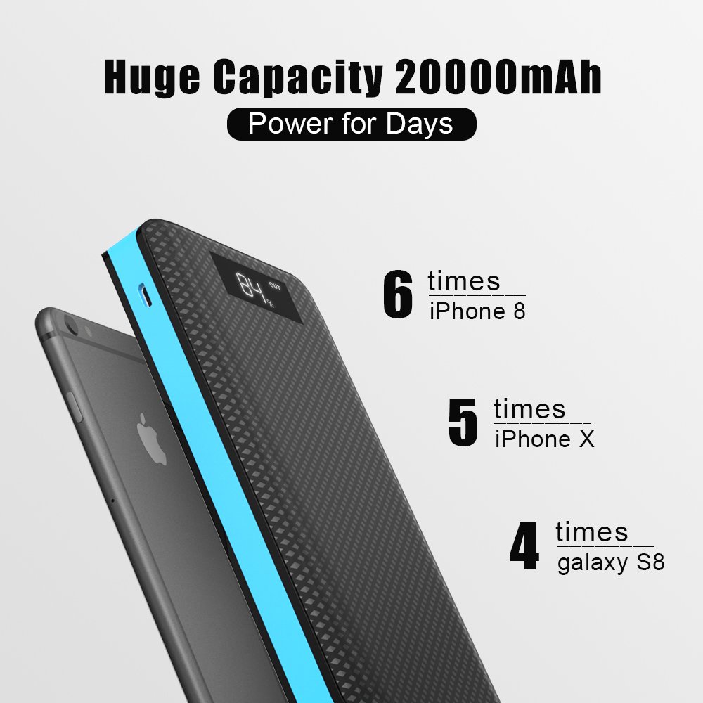 High power 20000 mAh can charge iPhone 8 6+ times, iphone X 4+ times, galaxy s8 4+ times.