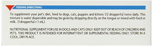 For supplementation of vitamins in active or aging dogs and cats. Water miscible formula can be mixed with food or milk. Ingredients in Hi-Vite Drops Water, sugar, sorbitol, polysorbate 80, liver extract, natural roast beef flavor, gelatin by-products, ferric ammonium citrate (source of iron), niacin, vitamin A palmitate, vitamin D3 supplement, d-pantothenyl, thiamine hydrochloride (vitamin B1), citric acid (a preservative), alpha tocopheryl acetate (vitamin E), pyridoxine hydrochloride (vitamin B6), methylparaban, sodium benzoate (a preservative), riboflavin 5'-phosphate sodium (source of vitamin B2), copper sulfate, BHA (a preservative), menadione sodium bisulfite complex (source of vitamin K), vitamin B12 supplement Directions for Use of Hi-Vite Drops To properly supplement diet: give dogs, cats, puppies, and kittens 1/2 dropperful twice daily. This mixture is water dispersible and may be given by dropping directly on the tongue or mixed with food or milk. (1 dropperful=1 ml)Feature