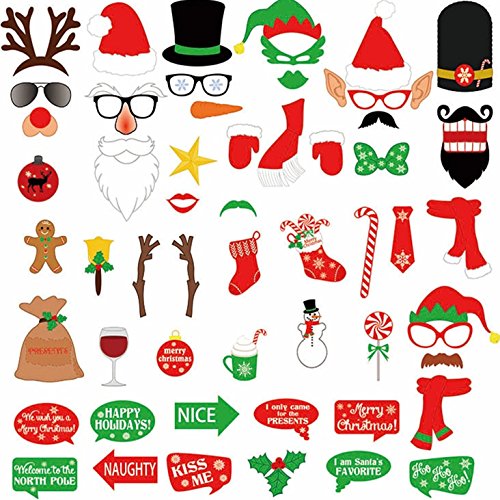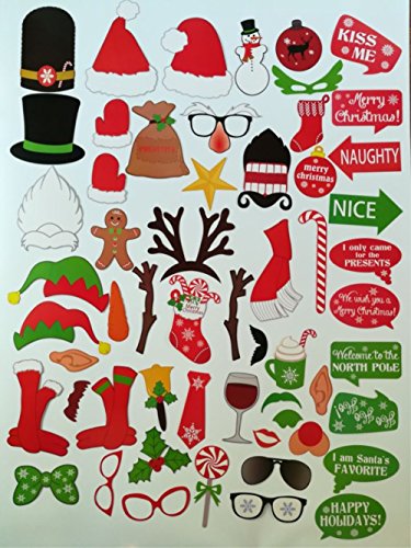 LASLU 57Piece Christmas Photo Booth Props Kit, DIY Christmas Photo Booth with stick Funny Xmas Selfie Props Accessories for Adults Kids for Christmas Theme Party Favors Decorations Decor Supplies