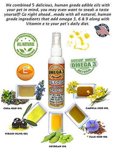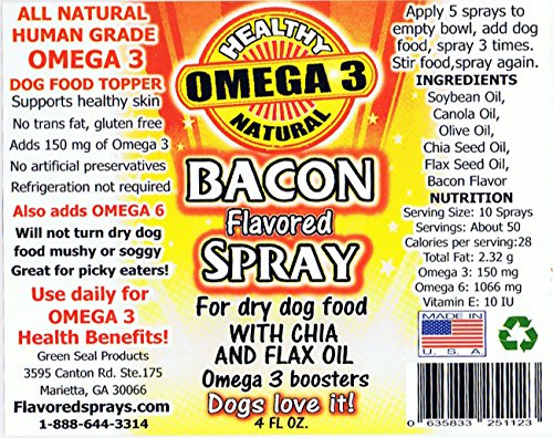 -. Binding : Misc. -. Brand : Flavored Sprays -. EAN : 0635833251123 -. Feature : Premium Dog Food Topper / No fish kill Omega 3 oil for dogs / All natural, human grade ingredients / Made from plant seed oils / No refrigeration required -. Label : Green Seal Products -. Manufacturer : Green Seal Products -. Model : BAC4 -. MPN : 4 oz -. PackageQuantity : 1 -. PartNumber : 4 oz -. ProductGroup : Pet Products -. ProductTypeName : PET_SUPPLIES -. Publisher : Green Seal Products -. Studio : Green Seal Products -. Title : Bacon Flavored Omega 3 Oil -. UPC : 635833251123