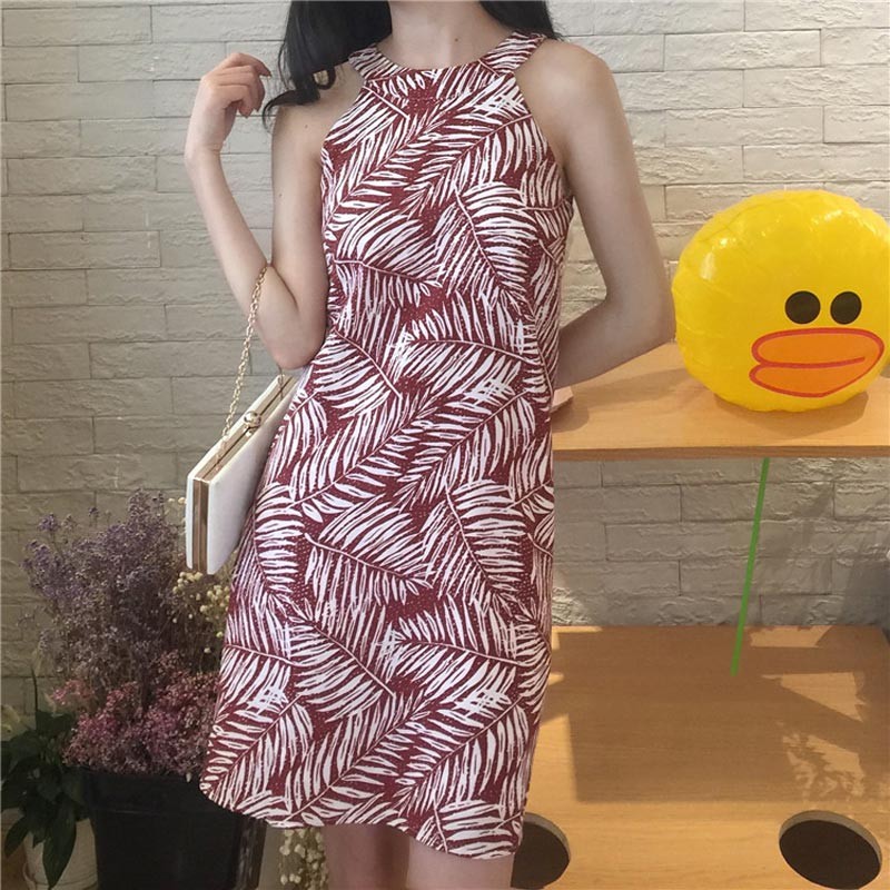 ブラウン地にホワイトリーフ模様のノースリーブワンピース♪