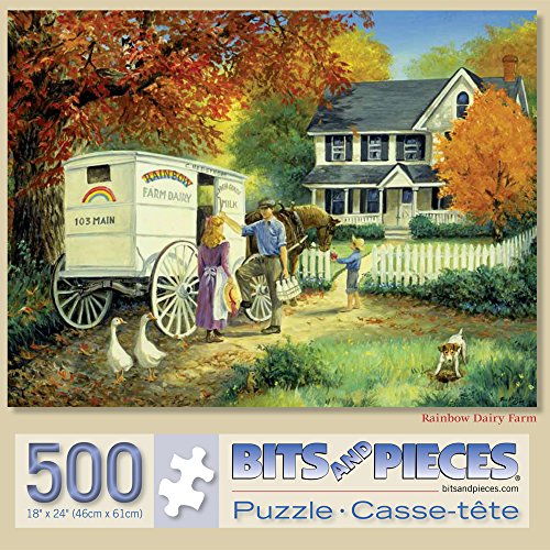 Studio : Melville Direct Publisher : Melville Direct Binding : Toy Product Description Mother comes to get the milk from the Rainbow Dairy Farm milkman while her son offers the dairyman's horse a snack. This 500 piece jigsaw is designed by Linda Picken and measures 18" x 24". Since the 16th century, jigsaw puzzles have been a favorite pastime for all ages. Now, with technological advances, Bits And Pieces has taken jigsaw puzzles to a new level of superior quality and challenging fun. Every original Bits And Pieces jigsaw puzzle is made with ultra-heavy weight board and cut with quality random puzzle dies with fully interlocking pieces for a secure fit. At Bits And pieces, we believe that every truly exceptional jigsaw puzzle starts with the work of a truly exceptional artist. We understand what it takes to make a great puzzle. The kind that challenges rather than frustrates, where each area has depth and detail that unfold into a larger beauty. Bits and Pieces commissions original artwork by artists from around the world to create imaginative artwork that puzzlers like you are looking for in a wide variety of puzzle sizes and styles for any age or ability. We know every puzzler is different, so every Bits And Pieces original puzzle is manufactured in two different piece counts, ranging from 100 pieces to 2000 pieces. We also have an innovative collection of specialty puzzles including glow-in-the-dark puzzles, glitter effects puzzles, unique shaped puzzles and puzzles with oversized pieces. 0
