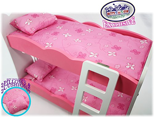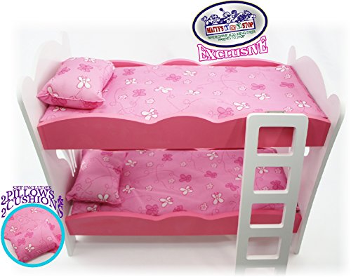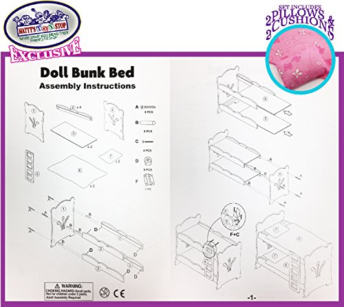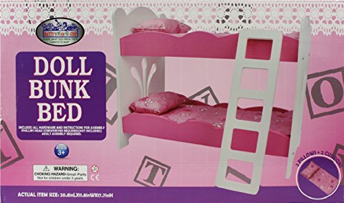 Studio : Homeware Publisher : Homeware Binding : Toy Product Description Matty's Toy Stop 18 Inch Doll Furniture Pink/White Wooden Bunk Beds with 2 Pillows, 2 Cushions Ladder - Fits American Girl Dolls, is AWESOME! Compatible with American Girl, Madame Alexander, Our Generation, so much more... Made of real, high quality wood! Features an awesome design that looks just like the real thing! Easy to assemble and the perfect addition to any playroom! Awesome for naptime with your dolls! Made of high quality composite wood products and features smart, sturdy construction! For Ages 3 and up - Bunk Bed measures 20.8" long x 11.8" wide x 17.7" tall - adult assembly required - phillips head screwdriver required (not included) 0
