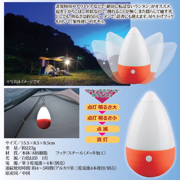 非常時用やアウトドアなどで「絶対に転ばないランタン」がオススメ。起き上がりこぼし形状なので、倒れることが無く、また揺らして癒す光としても。明るさは約50ルーメンで、読書にも使えます。吊り下げフックも付いて、案外使いやすそう。