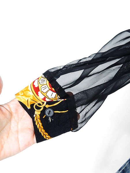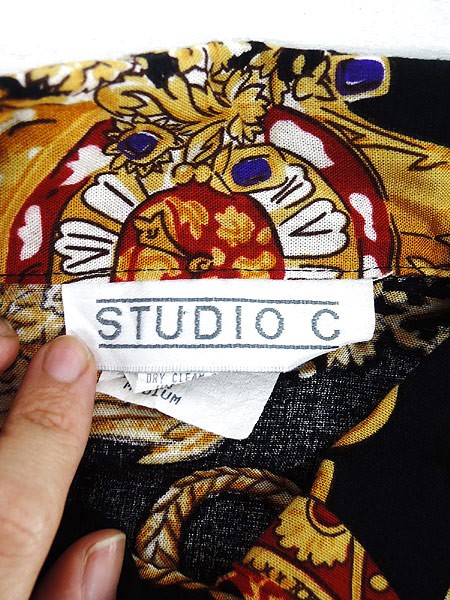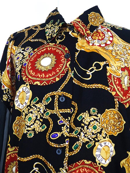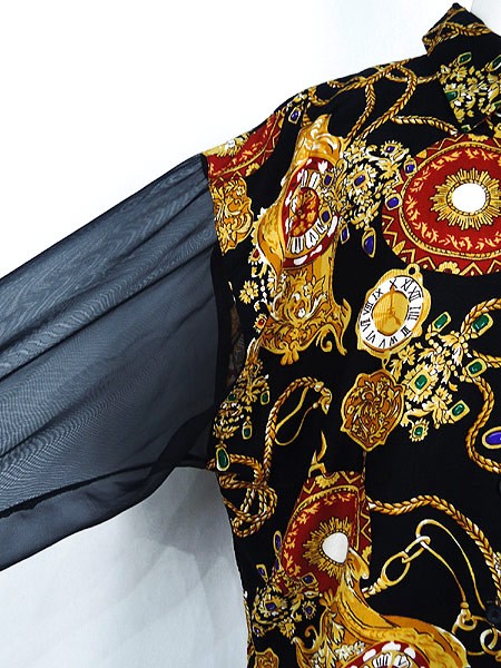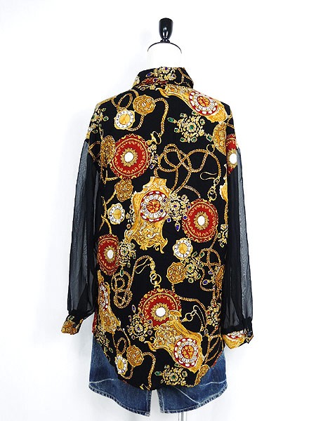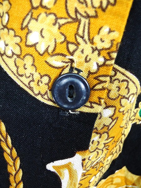 Ladies ブランド- カラー黒ベース メール便不可 コンディション★★★ 素材レーヨン 表記サイズM スタッフコメント第7ボタン付け替え跡あり。後ろ裾中央付近に糸引きあり。 実寸サイズ 着丈 75 cm 身幅 53.5 cm 肩幅 53.5 cm 袖丈 52 cm ※ウエスト・ヒップ以外は平置き採寸