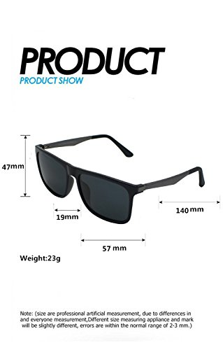Product Description Frame Features -The temples of these sunglasses are carefully constructed of high-quality, rust-free aluminium-magnesium alloy which is also called aerospace alloys or aircraft alloys. This is lightweight, durable, sturdy and Stylish. - Spring assisted hinge make these sunglasses comfortable to wear, even for larger face. -Fashion Smart design to fit your face curve and absolute comfort for everyday wear. Polarization - Pure Fashion Colors for select: Colors look vibrant, sharp and true. - Precise Details: See all the details you normally miss. - Anti-Glare: With glare form reflective surfaces reduced, you don't need to squint. - UV Protection: Polarized lenses eliminate UVA/UVB rays. Package includes 1 - Repair Screw 2 - Protect Scrap 3- Glasses 4 - Glasses cloth 5 - Glasses bag 6 - Glasses case 0