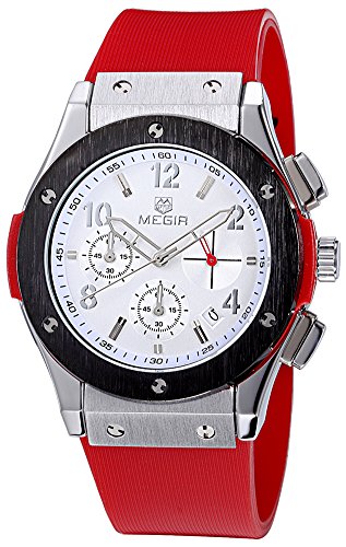 Megir MEGIR 레이디스 실리콘 밴드 합금 케이스 크로노그래프 방수 워치 스포츠 쿼츠 손목시계 3002M (레드)