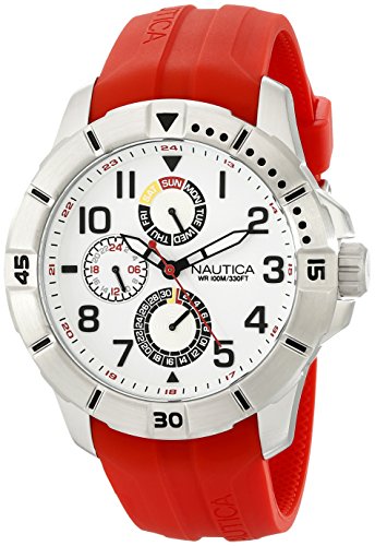 -. Binding : Watch -. Brand : Nautica -. Color : Red -. Department : mens -. EAN : 0656086072266 -. Feature : Watch featuring round white dial with trio of subdials, logo at 3 o'clock, and 24-hour display on dial border / 47 mm stainless steel case with mineral dial window / Japanese quartz movement with analog display / Logoed silicone band with buckle closure / Water resistant to 100 m (330 ft) -. Label : Nautica -. Manufacturer : Nautica -. Model : NAD12506G -. MPN : NAD12506G -. PartNumber : NAD12506G -. ProductGroup : Watch -. ProductTypeName : WATCH -. Publisher : Nautica -. Studio : Nautica -. Title : Nautica Men's NAD12506G NSR 300 Stainless Steel Watch with Red Band -. UPC : 656086072266