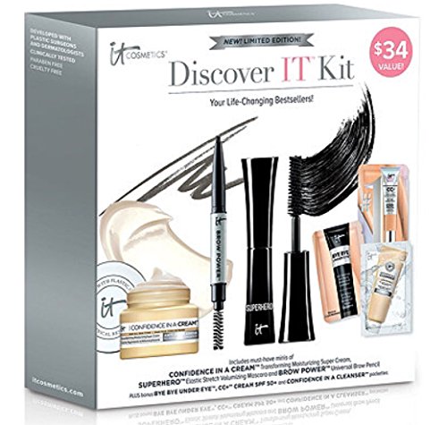 It discover travel kit including it confidence in a cream, superhero elastic stretch volumizing mascara, brow power universal brow pencil, plus bonus bye bye under eye, cc cream spf 50, confidence in a Cream packets
