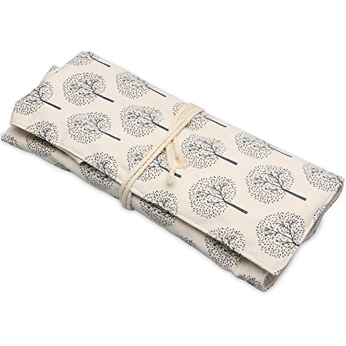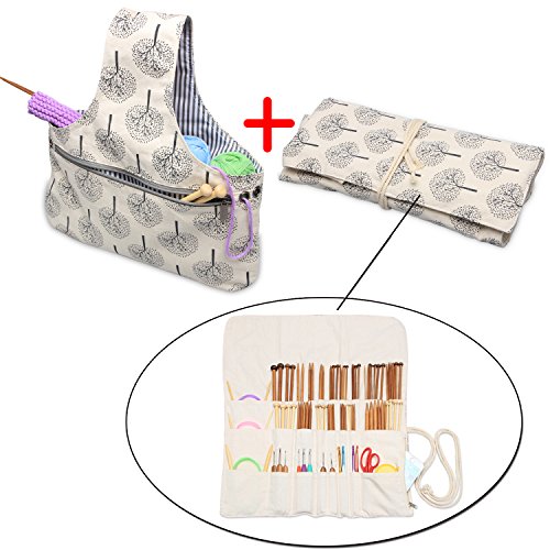 Teamoy 2 Pack Canvas Knitting Tote Bag and Knitting Needles Roll Holder for Yarn, Knitting Needles(14 Inches), Supplies and More, Perfect Size for Knitting on The Go(Large, Tree)