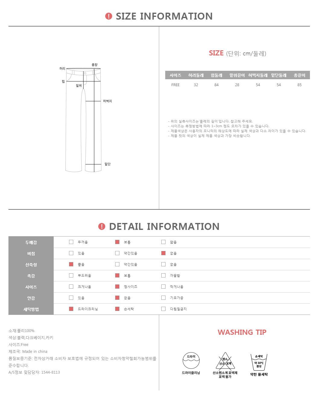 리멤버유 와이드 밴딩 팬츠 #73535MD COMMENT 허리밴딩과 와이드한 팬츠 품으로 여유롭고 편안한 착용감을 연출하는 밴딩팬츠를 소개할께요! 다양한 컬러구성으로 선택의 폭이 넓고 외출용으로는 물론 홈웨어로도 편안하게 착용하기 좋은 아이템이에요! 촤르르 떨어지면서도 하늘하늘한 소재감이 매력적인 팬츠랍니다DETAIL TIP 허리밴딩으로 편안한 착용감을 주며 와이드한 팬츠 품으로 편안한 착용감을 주는 밴딩팬츠예요! 와이드한 품으로 걸을때마다 하늘하늘한 움직임이 멋스럽고 가만히 서있었을때는 마치 롱 스커트를 입은듯한 스타일을 연출해주네요! 허리밴딩과 와이드한 팬츠품이 자연스러운 체형커버를 도와주어 실용적인 아이템이에요!COLOR,SIZE TIP 컬러는 블랙,다크베이지,카키 컬러로 구성되어 있으며, 모델의 착용 컬러는 블랙 입니다. 사이즈는FREE(44-66)사이즈로 진행되오니 고객님의 체형에 맞게 선택하셔서 예쁘게 착용하시길 바랍니다.