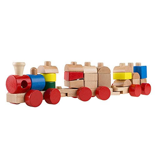-. Feature : Classic wood interactive learning toy train set - includes stacking blocks and shapes! / The classic wooden train set is an easy-to-use, stacking learning train that teaches toddlers about trains, connectivity and movement. / Perfect for toddlers, this classic push and pull toy develops both gross and fine motor skills and promotes activity and exploration. / The train cars are a great and fun way for child learning and development. The train can be connected in different configurations with the string and peg hooks to help promote hand-eye coordination. / Fully connected and assembled train dimensions are 17" long x 3" wide x 4" high. The 20 different wooden pieces come in wood, red, blue, yellow and green.
