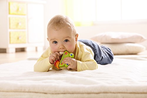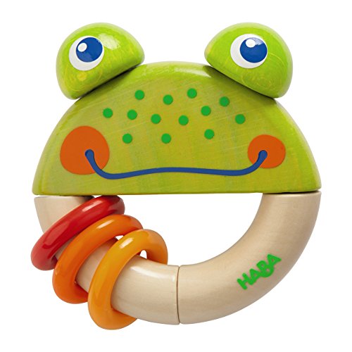 This grinning frog friend is the perfect first toy. Your child will be drawn to the bright colors and will find lots of enjoyment simply exploring its textures, examining the colored rings and shaking it all around. This German-made wooden teether and the smaller wooden rings attached to it are expertly designed to help develop clutching and grasping skills. Made in Germany of solid beech wood and plastic.
