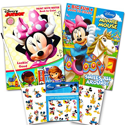 Delight your Disney Junior and Minnie Mouse fan with this Disney paint with water super set! Featuring Mickey and Minnie Mouse, Princess Sofia the First, Doc McStuffins, Donald Duck, Goofy and More! Disney Minnie Mouse Paint with Water Book measures 8 x 11 inches and includes 16 painting pages and 1 paint brush. Just dip in water and watch the pages come to life! Children paint and color their favorite Disney Minnie Mouse, Sofia the First and Doc McStuffins characters using water. Provided hours of mess-free painting fun. Includes classic Disney Mickey Mouse Clubhouse coloring book. 96 pages of coloring and activity fun with Mickey Mouse, Minnie Mouse, Donald Duck and Goofy! Includes a pack of Disney Minnie Mouse stickers. Great gift for your favorite Disney Junior and Minnie Mouse enthusiast! Perfect as Disney Junior and Minnie Mouse party supplies and party activities.Feature