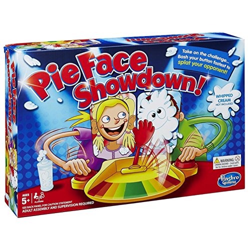 -. Binding : Toy -. Brand : Hasbro -. Color : 2 Face -. EAN : 0699902287246 -. Feature : Pie-throwing arm could go off at any moment / Hilarious family fun / Easy to set up and clean -. IsAdultProduct : 0 -. Label : Hasbro -. Manufacturer : Hasbro -. Model : C01931020 -. MPN : C01931020 -. PackageQuantity : 1 -. PartNumber : C01931020 -. ProductGroup : Toy -. ProductTypeName : TOYS_AND_GAMES -. Publisher : Hasbro -. Studio : Hasbro -. Title : Hasbro Pie Face Showdown Game -. UPC : 699902287246