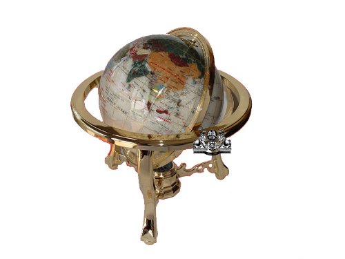 Studio : American Dwelling Group, Inc Publisher : American Dwelling Group, Inc Binding : Kitchen Product Description This unique gemstone globe is brand new and in perfect condition. It is painstakingly handcrafted by the most talented artists by, using more than 30 different semi-precious gemstones from all over the world. This globe have used large amount of crashed pearls that pulverized, and mixed with an epoxy and poured to make the ocean part of the globe (it is a very complicated and expensive procedure, precise control of temperature is the most essential factor in the processing cycle). This is a huge amount of striking and dramatic hand-crafted stone work. This globe is built with the beautiful ornate, tripod leg heavy gold brass stand into which the globe has been carefully mounted. At the bottom of the stand, a precise glass-topped integral brass compass is incorporated to complement the globe. Each country is inlaid from a different stone, and the stones are individually cut and ground to exacting interlocking shapes, polished and set into this exquisite piece of art with care and attention to adjacencies. The elements of the globe are created out of lapis lazuli, mother of pearl, amethyst, african jade, tiger's eye, jasper, turquoise, purple quartz, onyx, unakite, abalone, green marble and many other beautifully hued and richly veined stones. The latitude and longitude lines are very thin ribbons of polished brass, embedded through the globe. Each globe requires ten individual steps to compose and it takes more than 1500 hours of labor to complete. 0