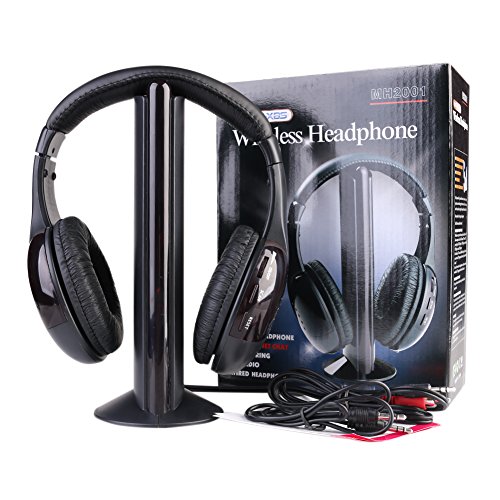 -. Feature : ●Professional 5-in-1 Wireless Headphone System. / ●Wireless headphones let you listen to your TV show or music without disturbing others. / ●Wireless Earphone: Wireless reception from any electrical device with audio output such as full-channel TV sound, PC, game player, DVD player, VCD player, audio device, MP3 player, and CD player. / ●FM Radio: The headset can be used as FM radio separately, which search and lock channels automatically. / ●Wired Earphone: Equipped with audio cable, the receiver can be used as a wired earphone.