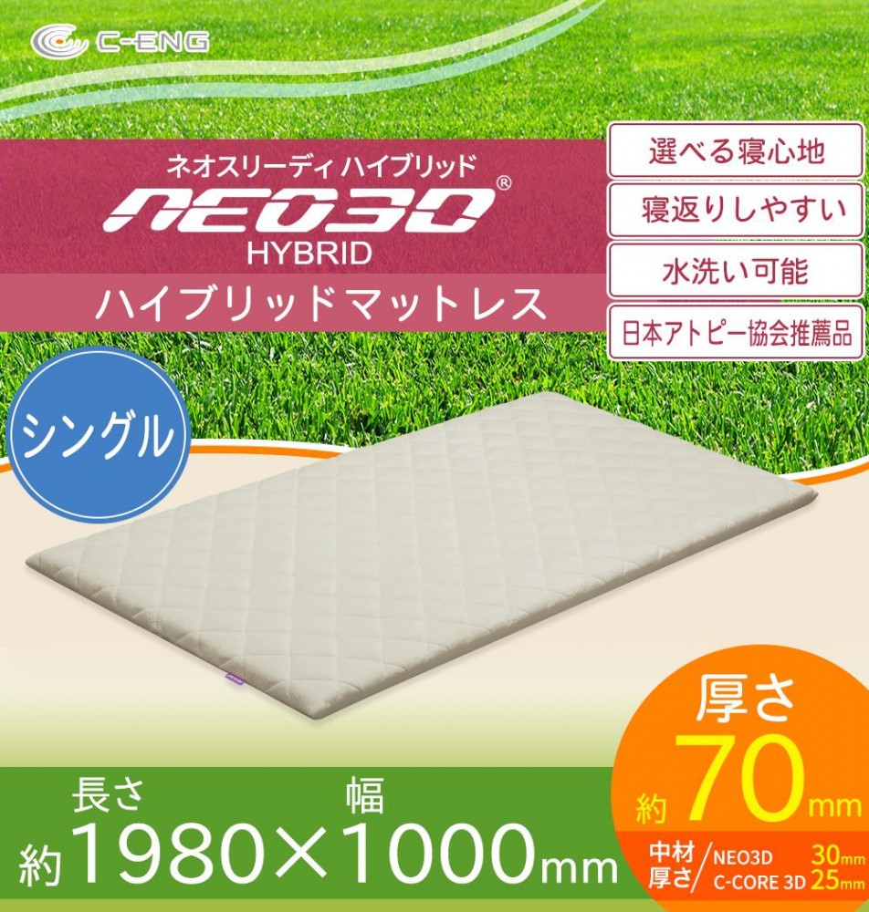 | 高反発素材のC-CORE3Dと医療・介護の現場でも使われているNEO3Dを中材に使用したハイブリッド構造のマットレスです。2種類の硬さの違う中材を使用しているので、上下を入れ替えることでお好みの寝心地をお選びいただけます。NEO3D側は電気毛布の使用が可能!!中材は繊維が網状に絡み合った構造をしているため、通気性に優れ、湿気がこもることがありません。日本アトピー協会推薦品。空気が循環しやすく患部を衛生的に保てます。 |
