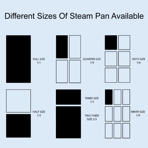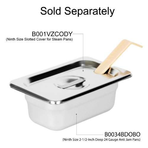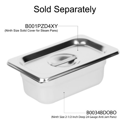 Studio : Excellante Publisher : Excellante Binding : Kitchen Product Description Excellante ninth size 2-1/2-inch deep 24 gauge anti jam pans. The anti-Jam, heavy-duty, 24 gauge, stainless steel steam pans are used as durable food holders. They are perfect for holding food, condiments, or any other eatery items. The anti-jam feature makes the steam pans easily removable. The corners allow easy manueverability between pans. NSF(National Sanitation Foundation) listed. 2 steps in choosing the right size of steam pan that you are looking for: (1.) In foodservice industry, we use full, half, third,-quarter, sixth and ninth size as referring to standard steam pan size term. You can mix and match sizes to give you one full size steam pan space. For instance, you can buy 2 half size, or 3 third size steam pans for your full size chafer or food warmer. ( 2.) Next selection is the depth of the steam pan. Standard sizes are 2-1/2, 4 and 6-inch deep. 0