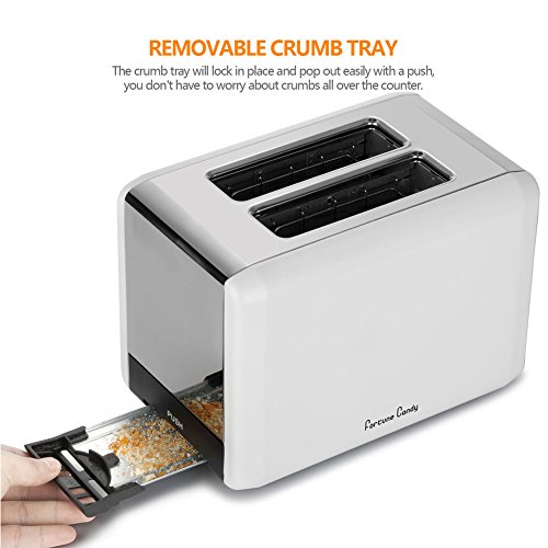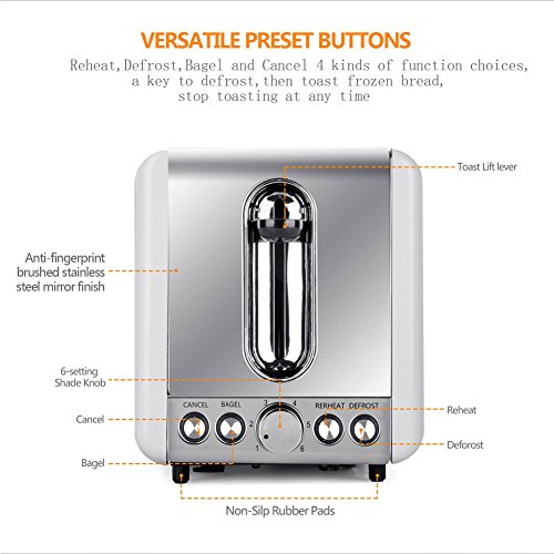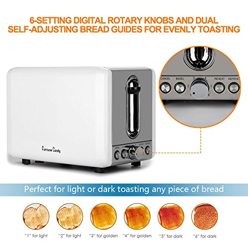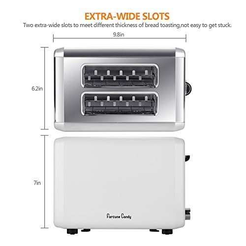 2 Extra-Wide Toasting Slots:make this white stainless steel 2-slice toaster accommodate all types of breads and bagels,not easy to get stuck.